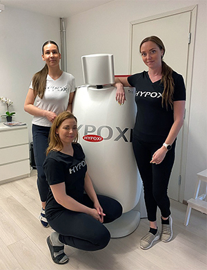 Irina, Matilda und Eveliina sind ausgebildete Kosmetikerinnen, Anni ist Friseurin. Irina ist die Besitzerin des Kosmetik- und Friseursalon, in dem unser HYPOXI-Studio integriert wurde. In einem großen Raum im hinteren Teil unseres Salons, sind die HYPOXI-Dermologie und der HYPOXI-Trainer S120 im Dauereinsatz!